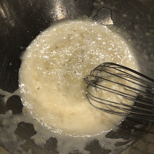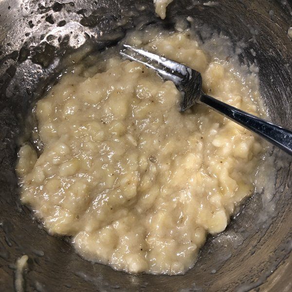 Mash the bananas with a fork until they are good and mushy. (note: It's best to use very ripe bananas with lots of brown spots.)