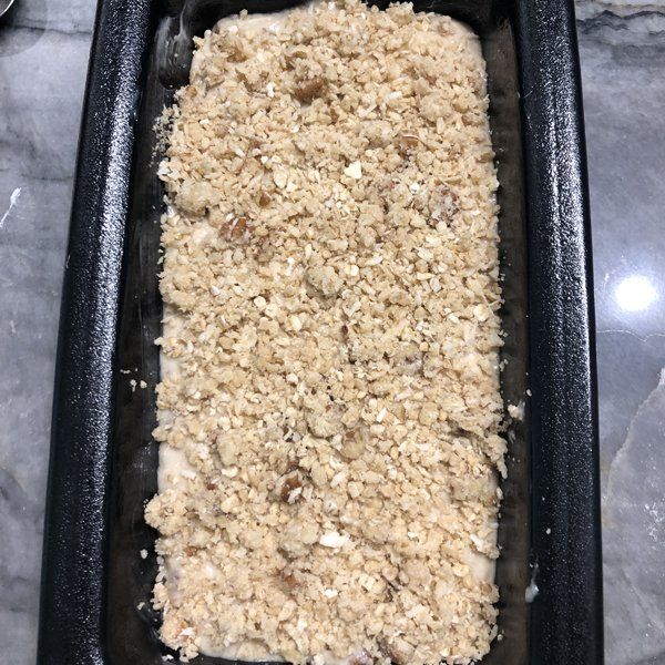 Pour the batter into the prepared pan. (optional: Top with an crumble made of 1/4 cup quick oats, 2 Tbsp margarine, 2 Tbsp minced nuts, 1 Tbsp flour and 1 Tbsp brown sugar)