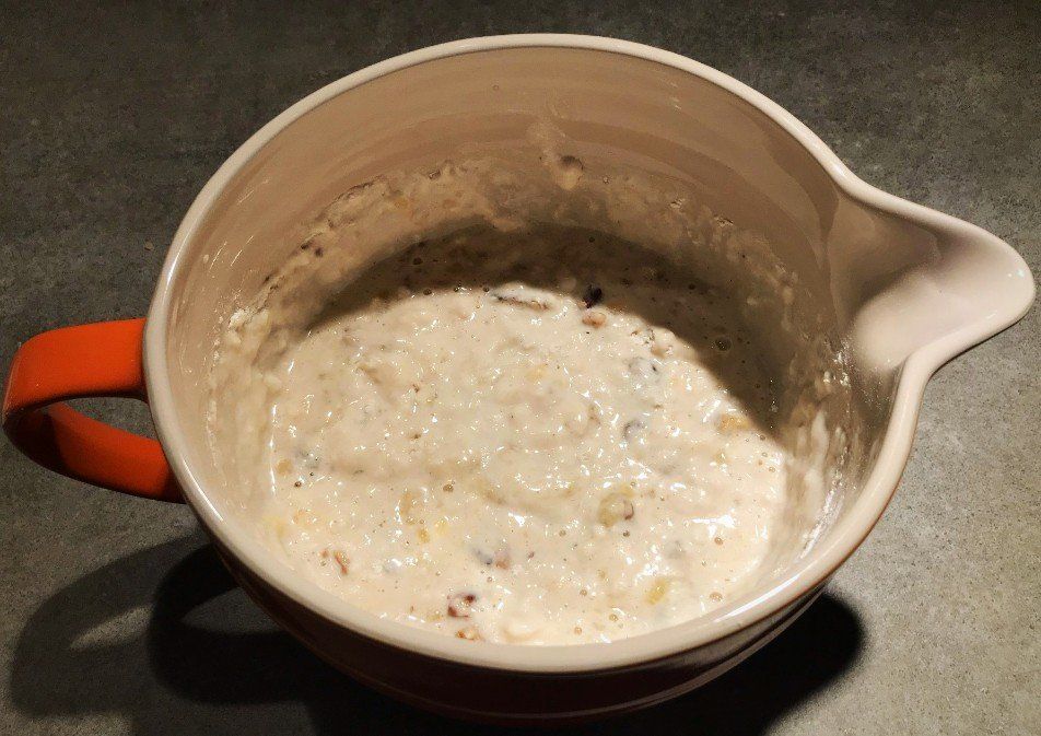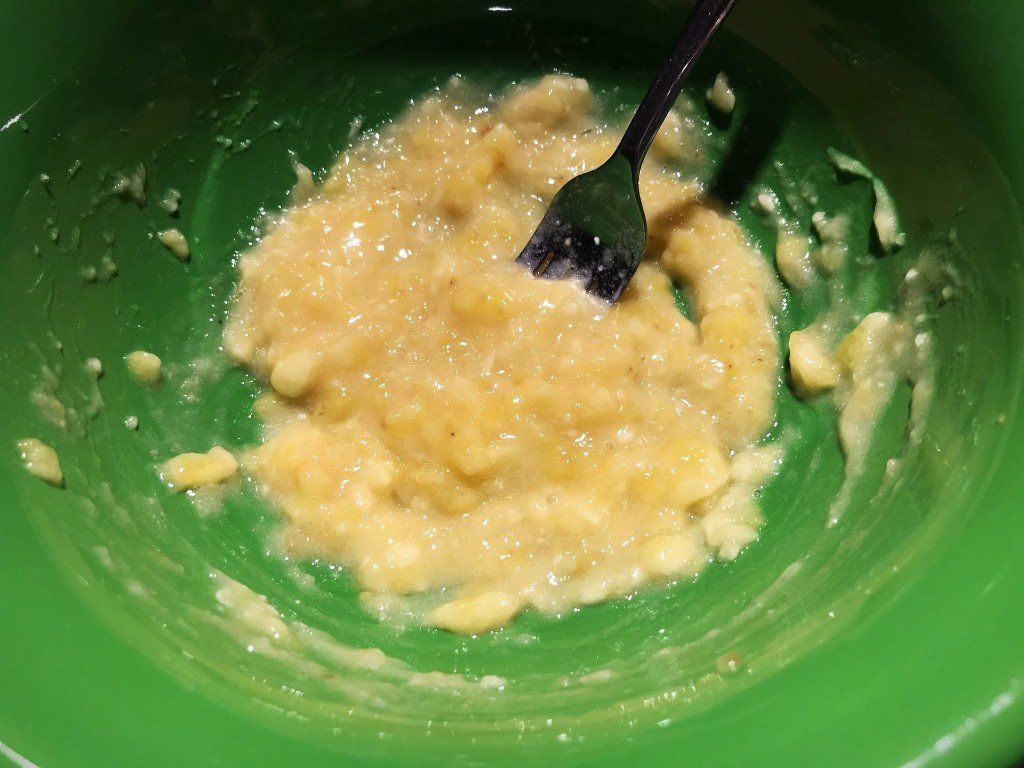 Peel the banana and place it in a medium bowl. With a fork, mash the banana really well until it's pretty smooth and creamy. Add the milk, flax seed and oil to the banana and stir until well combined.