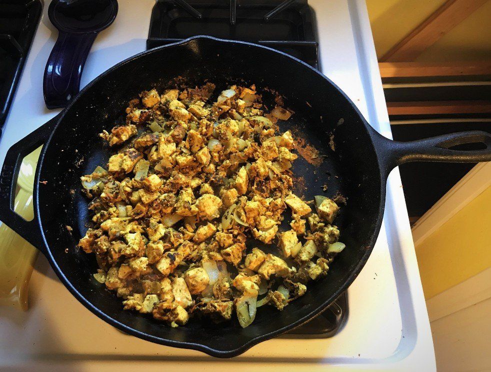 Let the scramble continue to brown a bit more until you have the preferred texture. If things seem a bit too dry, go ahead and add water a tablespoon at a time.