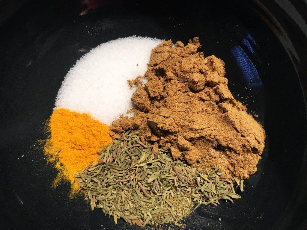 In a small bowl combine the spices (do not include the nutritional yeast) and two tablespoons of water and mix with a fork until the salt has dissolved leaving you with a mustard-colored slurry.