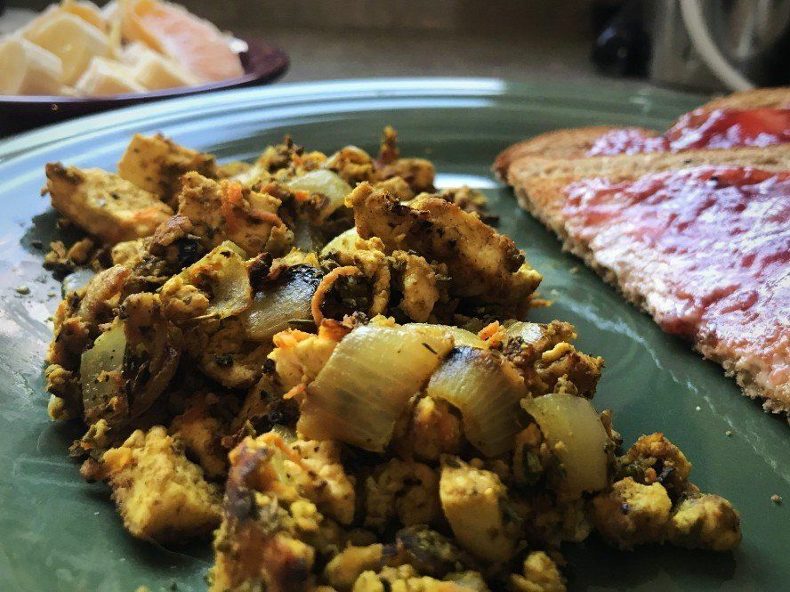 Since I'm a self-professed "sugar whore," I usually like to start my day with something on the sweeter side (like these amazing pancakes) but every once in a while I crave something more savory. On those days, my favorite thing to make and eat is this tofu scramble. Sure, this takes longer to make than scrambled eggs but at the end of the 20 minutes of prep and cooking your house will smell amazing and you won't have to eat any disgusting eggs.