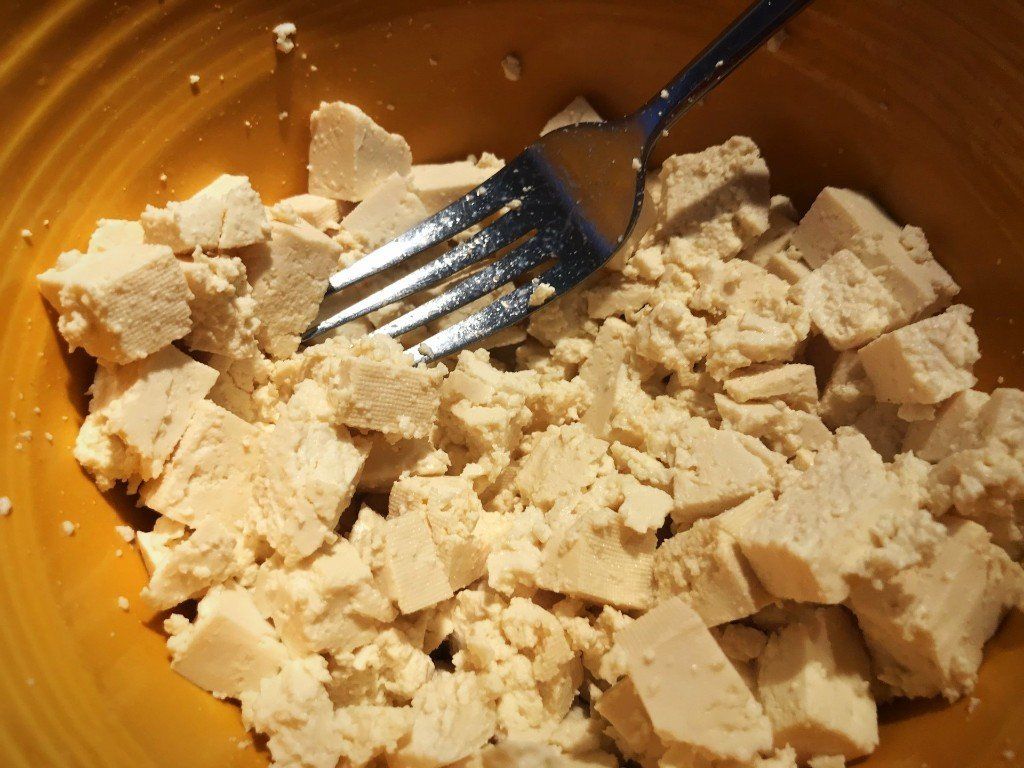 Press and drain the tofu to remove most of the excess water. Put the tofu in a medium bowl and break it apart into whatever size crumbles you'd like.