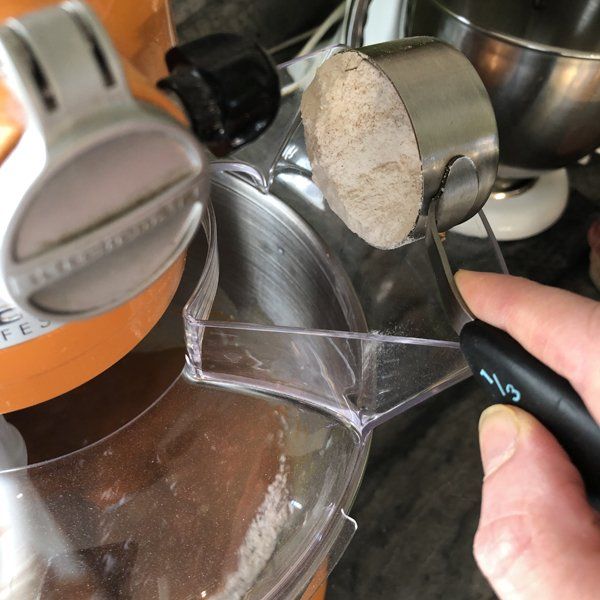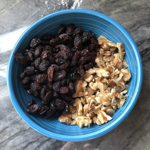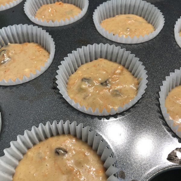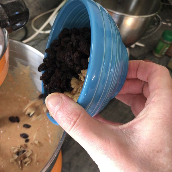 With the mixer on low, add the dry ingredients to the wet about 1/2 cup at a time adding the next 1/2 cup after the previous one is well combined. Once all of the flour has been added, beat for an additional 15-30 seconds and then add in the raisins and nuts (if using). Beat until the nuts and raisins are incorporated.