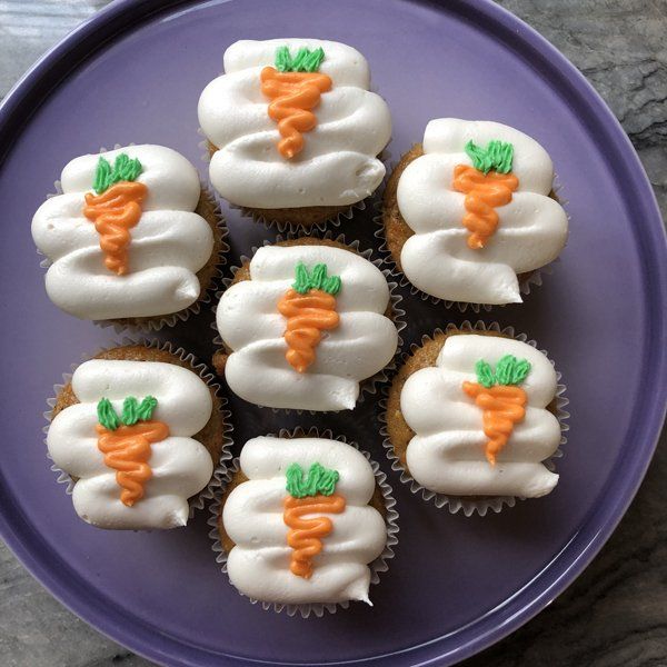 Frost the cupcakes however you see fit. Feeling lazy? Just slather some on top. Wanna act like you're a big shot? Break out the old cake decorating bag and make 'em look real pretty by separating and coloring some frosting orange and green and make some carrots on top