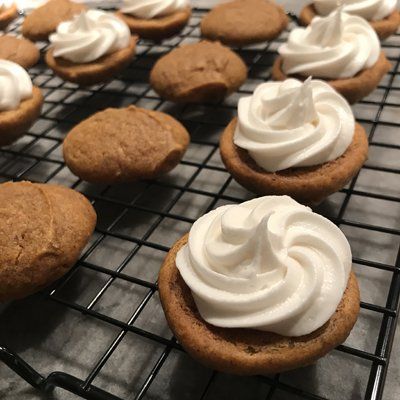 To frost the whoopie pies, decide which ones are tops and which ones are bottoms and flip over half of them. On the ones that have been flipped over, pipe on a dollop of frosting on each one and then gently press the top on so that the first comes to the edge.