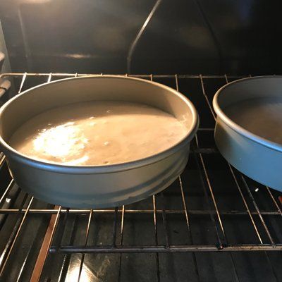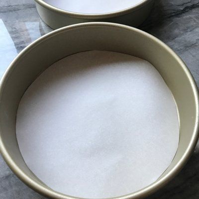 Line the bottom of two 8” cake pans with parchment paper. (Don’t grease the sides of the pan as this will cause the sides of the cake to not cook properly.)