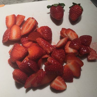 It’s hard to say exactly how many strawberries you will need. I usually use about 12 ounces for my cake which includes the ones in the middle layer as well as some for decorating the top. Rinse and dry the berries. Set a few aside for use in decorating the top of the cake. Trim the tops off all of the remaining berries then slice them into roughly 1/4 inch slices and set aside as you get ready to assemble the cake.