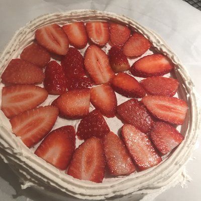 Use the remaining strawberries to decorate the top of the cake how ever you’d like.