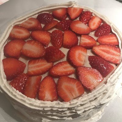 Now cover the cake with a layer of sliced strawberries. Then cover this layer of strawberries with a layer of pastry cream. Next lay down a layer of sliced strawberries on top of the pastry cream. (Depending on the thickness, you may need to pipe a third ring of frosting along the outside again. This wall helps keep the pastry cream from oozing out the sides.)