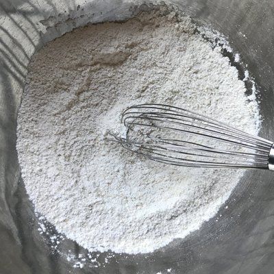 While the aquafaba is beating, combine the flour, sugar, baking powder, baking soda and salt in a large bowl and combine with a whisk.