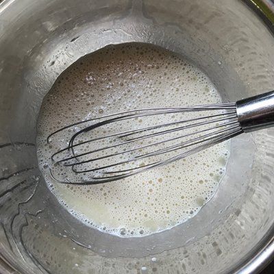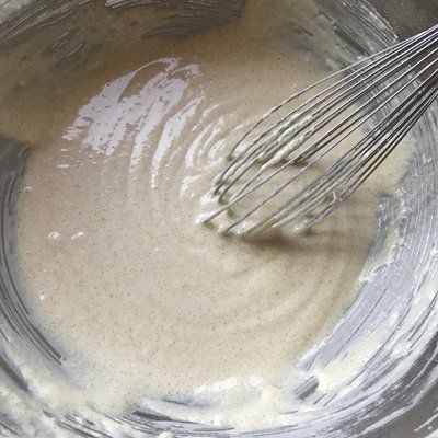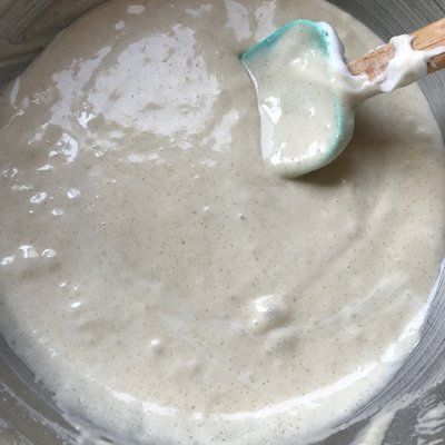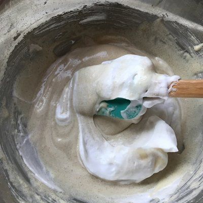 Add the whipped aquafaba to the batter and with a spatula, gently fold the aquafaba into the batter. Be gentle in this step since you want to maintain as much of the air from the aquafaba as possible. Fold and gently stir until you no longer see any white streaks.