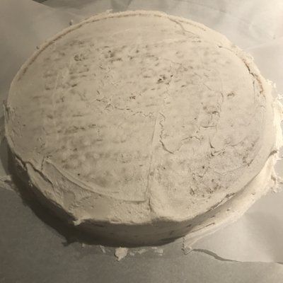 Once the cakes are cool you can finally assemble the layers. Place one of the cakes on a cake stand or plate. (I usually place 4 pieces of wax paper or parchment paper under the edges of the cake so that the plate stays clean as I frost it.) Spread the frosting around the outside of the cake and then put a very thin layer of frosting on the top of the cake. (This thin layer will help keep the bottom layer of cake from getting soggy.)