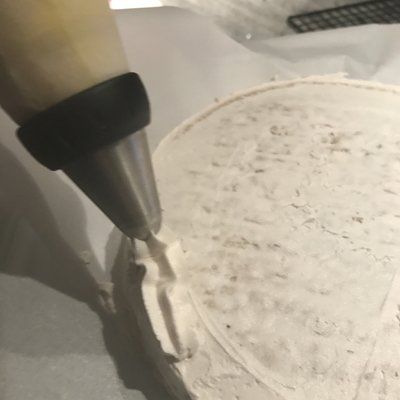 Next take the pastry bag with the frosting and pipe a wall of frosting around the outside. Repeat another layer of piped frosting onto of the first one.