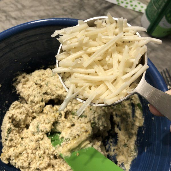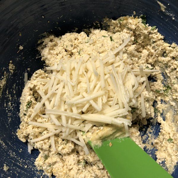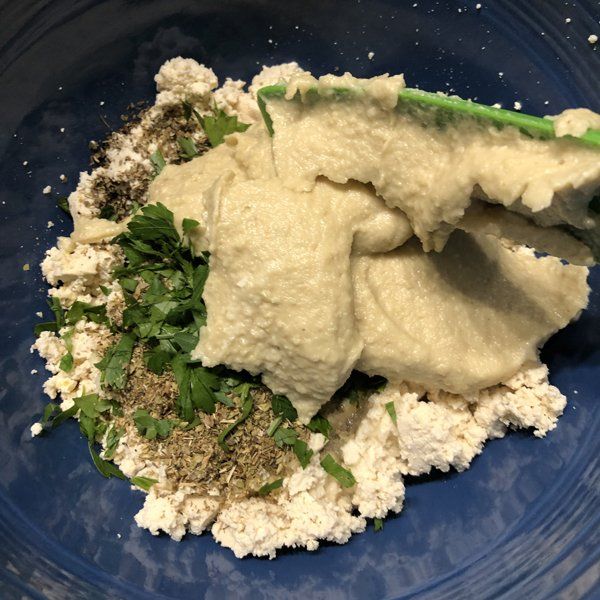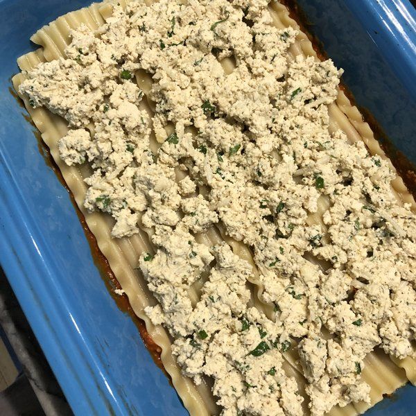 Well-drain the tofu. This is an important step to make sure you don't have a soupy lasagna at the end. I usually press it in my tofu press for about 15 mins then mash the tofu in a large bowl. (If it still seems too wet, put it in a clean dish towel or cheesecloth and wring out even more of the liquid.