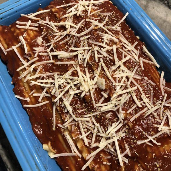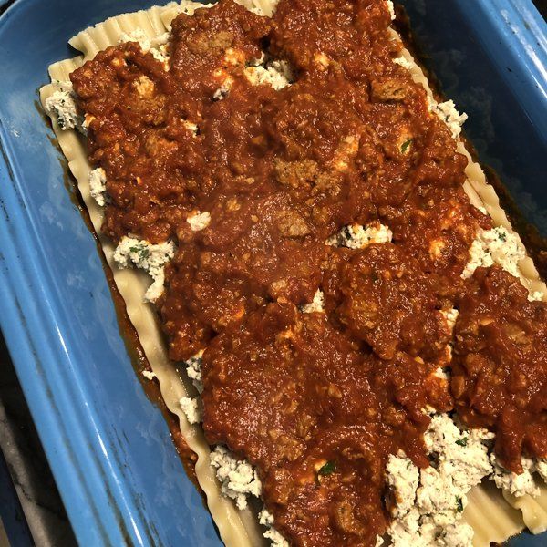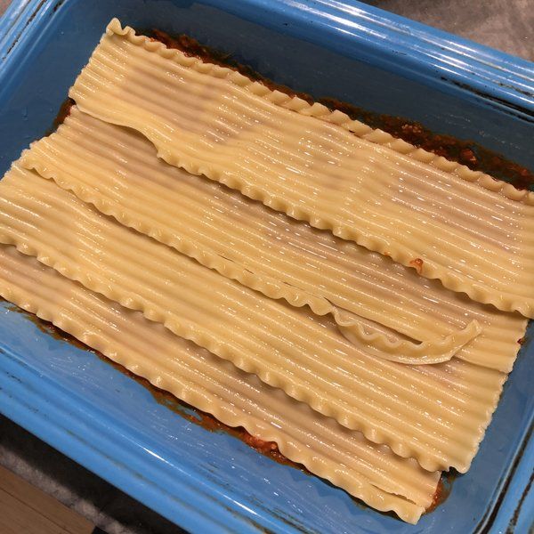 Now get ready to assemble the lasagna. Place a 9"x13" baking dish on the counter and put your sauce, noodles and filling nearby. (tip: When the pasta is cooked, drain it and then put it in a large bowl filled with cold water. This makes the noodles easier to handle.)