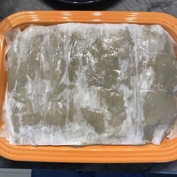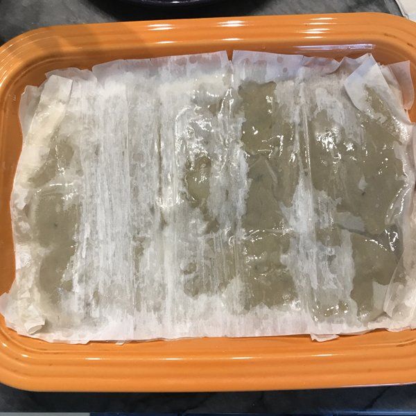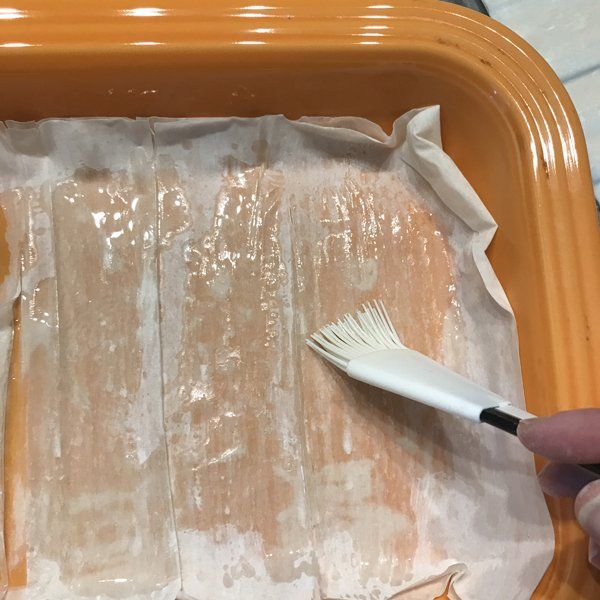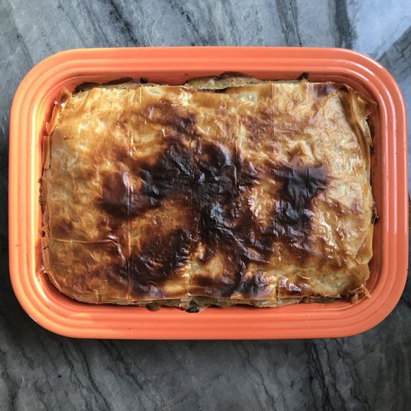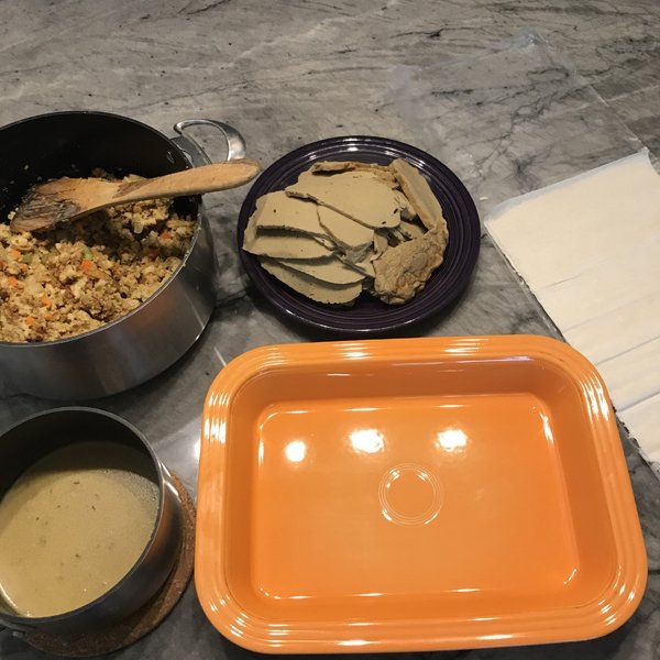 Now it's time to get your assembly station ready. Place a 9"x13" baking dish on the counter and put your stuffing, gravy, seitan and phyllo dough nearby. You'll also need a pastry brush and a small bowl with a few tablespoons of olive oil in it for brushing the phyllo.