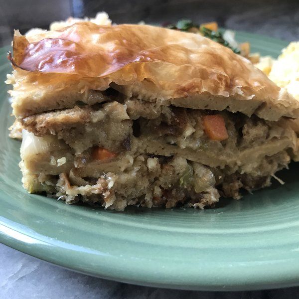 First brush a small coat of oil on the bottom of the baking dish. Now layer one sheet of phyllo in the dish and then brush the top of the dough with a bit more oil. Repeat this with 3 or 4 more sheets of phyllo. Next spread a layer of stuffing onto the phyllo. Now top the stuffing with slices of the seitan and then cover that with a healthy drizzle of gravy. Next add another layer of 4 to 5 sheets of phyllo brushing oil on each layer. Repeat the stuffing, seitan and gravy steps. Finally top it with the last 4 or 5 sheets of phyllo again brushing each one with oil.