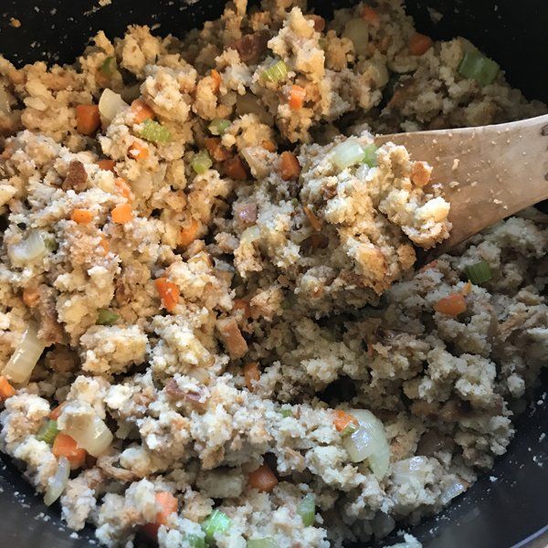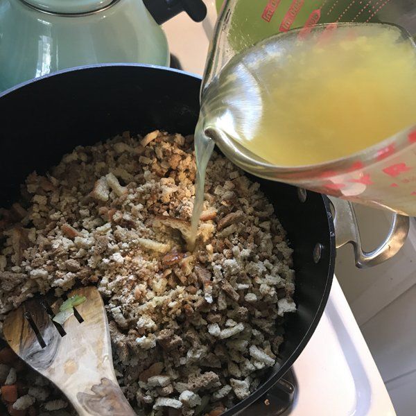 Now add the bread cubes and the stock and stir to combine until all of the bread cubes are moist. Remove from heat and cover.